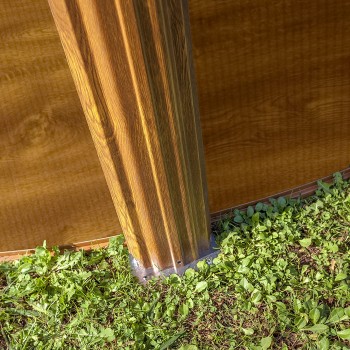 - Parete con lamiera in acciaio effetto legno di 40/100 di spessore. La lamiera è ritagliata per lo skimmer filtrante