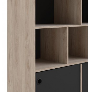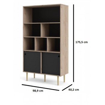 Libreria 175 cm Nero opaco e rovere con due ante scorrevoli e sei ripiani
