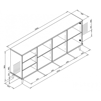 - Dotata di tre ante, tre vani a giorno e tre ripiani interni regolabili in altezza