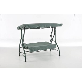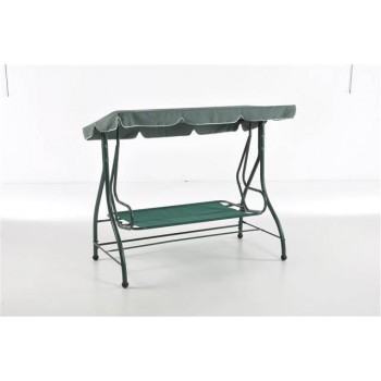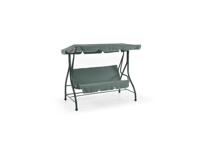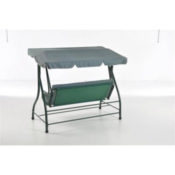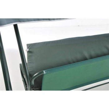 Dondolo 3 posti con schienale reclinabile, struttura in ferro verniciato a polvere colore verde (finitura opaca), tessuto cuscino seduta e schienale poliestere g 180/mq spessore cm 8 colore verde scuro, tessuto tettuccio poliestere g 180/mq colore verdescuro.