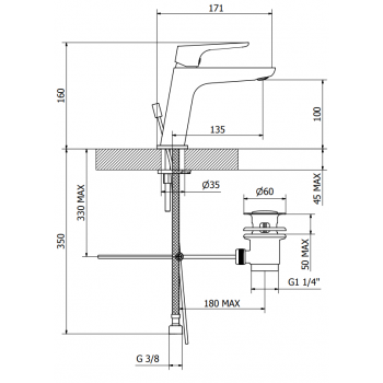 Miscelatore lavabo con leva in metallo con scarico automatico G 1 1/4", monocomando in ottone cromato monoforo, della linea EDGE.