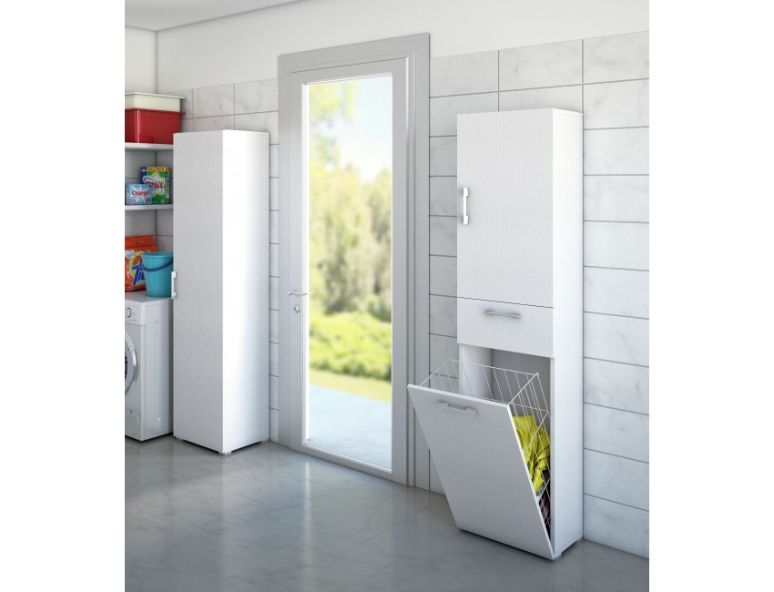 Mobile lavanderia 45X195H Bianco Frassinato con anta cassetto e cestello portabiancheria
