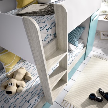 Letto a castello Crystal per due bambini Bianco opaco Smeraldo e Rovere grigio con armadio