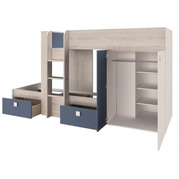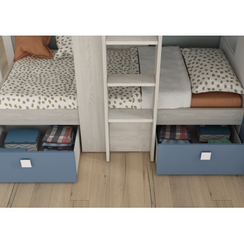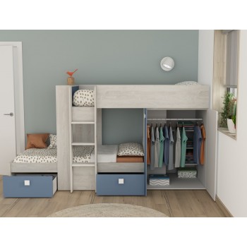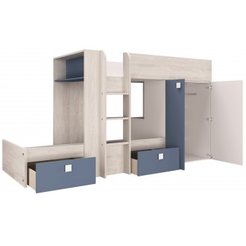 Letto a castello Alvin per due bambini Blu fumo Rovere e Bianco opaco con armadio