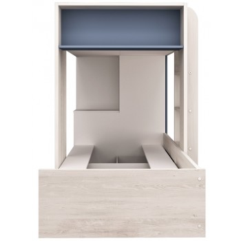 - Il letto superiore è dotato di un ripiano sul fondo e di un altro ripiano singolo con accesso dai piedi del letto, perfetto per riporre libri e oggetti.