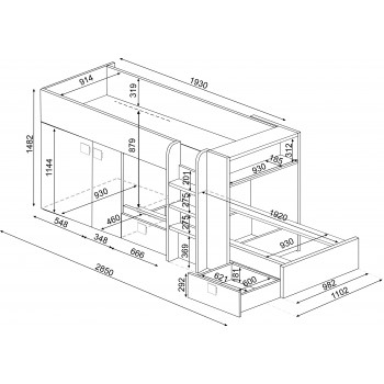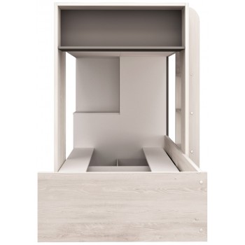 - Il letto superiore è dotato di un ripiano sul fondo e di un altro ripiano singolo con accesso dai piedi del letto, perfetto per riporre libri e oggetti.