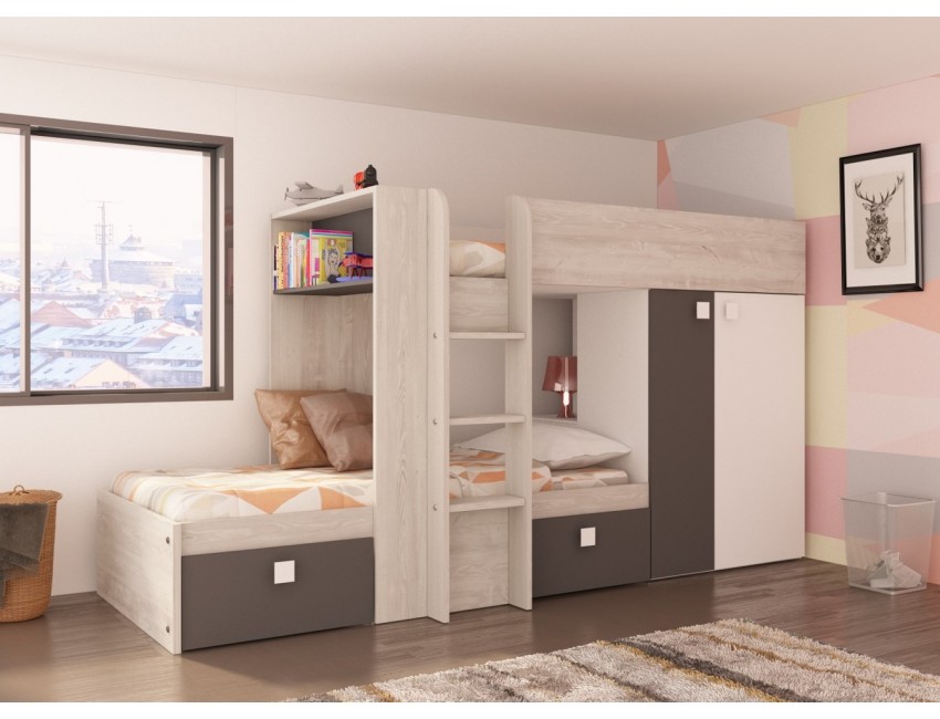 Letto a castello Alvin per due bambini Nero grafite Rovere e Bianco opaco con armadio