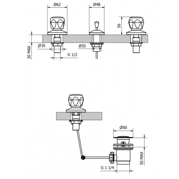 Batteria bidet composta da 3 pezzi scarico automatico da G1”1/4.