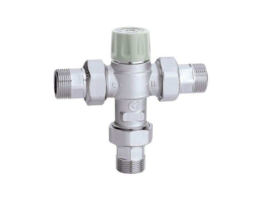 Miscelatore termostatico regolabile con manopola, con valvole di ritegno e filtri.