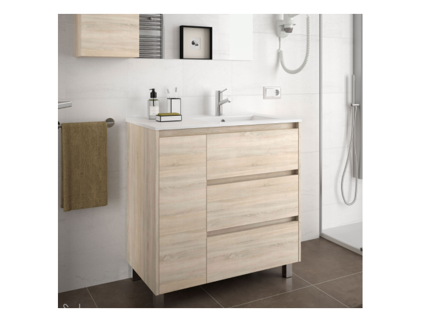 1) Mobile da bagno moderno in legno, colore marrone Acacia, con un'anta e 3 cassetti a chiusura ammortizzata e piedini metallici