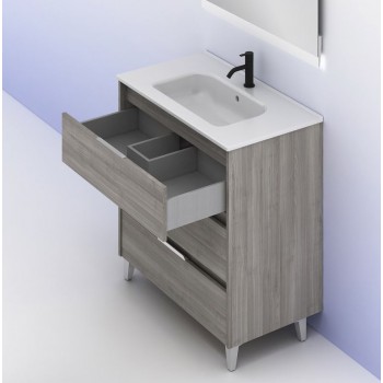 1) Mobile bagno a terra con una struttura realizzata in pannelli melaminici da 16 mm. Il prodotto è composto da 3 cassetti realizzati con guide metalliche a chiusura ammortizzata e accessibilità totale all'interno del cassetto. Le maniglie sono metalliche in finitura cromata integrate nella parte superiore del frontale dei cassetti. Sono INCLUSI i supporti per il fissaggio alla parete. L'interno dei cassetti è fabbricato in texture grigia.