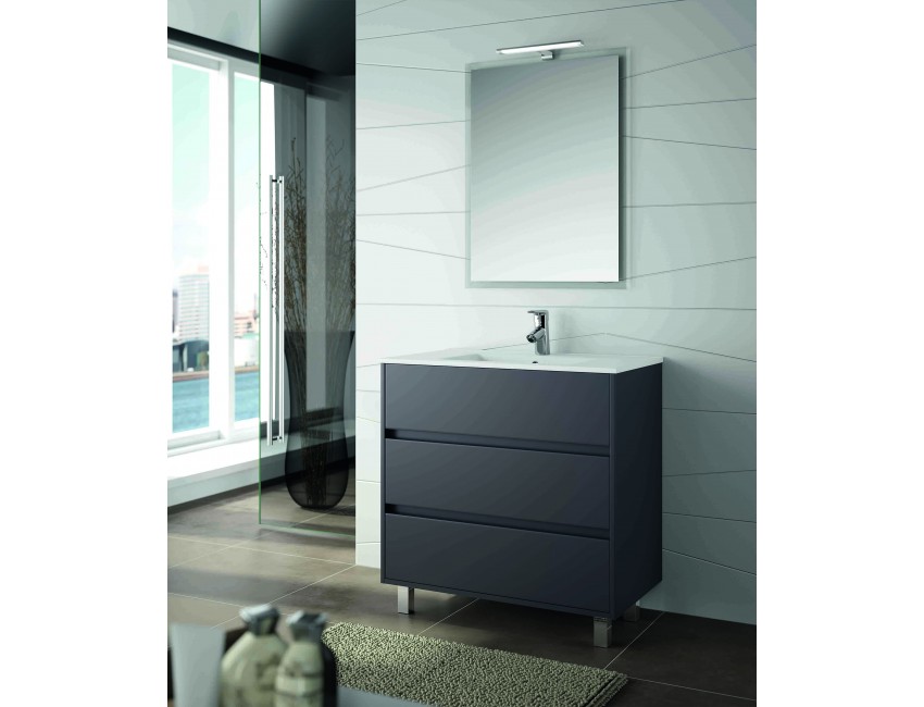 1) Mobile da bagno moderno in legno, colore grigio opaco, con 3 cassetti a chiusura ammortizzata e piedini metallici
