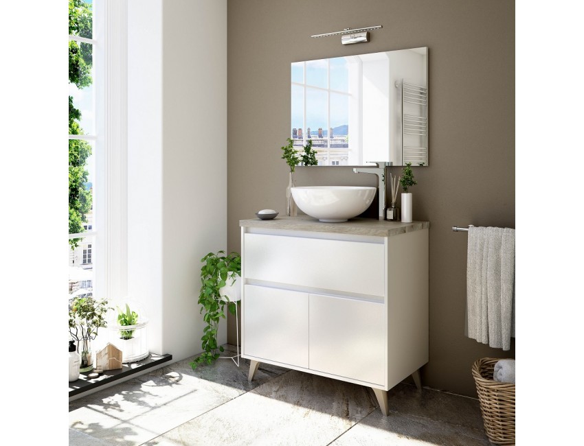 Mobile bagno a terra 80 cm Bianco lucido e Rovere con Lavabo a ciotola