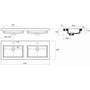 Dimensioni lavabo: L 140,5 x P 46 x H 5 cm (profondità vasche: 11,8 cm)