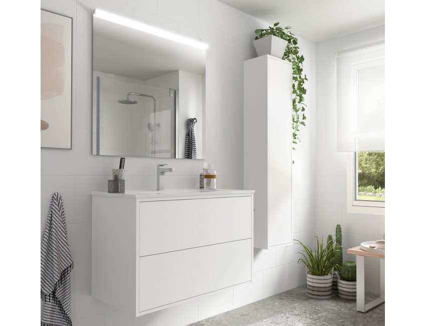 1) Mobile da bagno moderno colore Bianco opaco dotato di 2 cassetti a chiusura ammortizzata e con sistema di apertura a pressione che unisce funzionalità e design. Frontale e laterali sono fabbricati in laminato da 16 mm (classe E-1) con bordi in PVC (con colla PUR). Completo di fissaggi certificati di alta qualità. Divisore per cassetto superiore incluso.