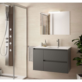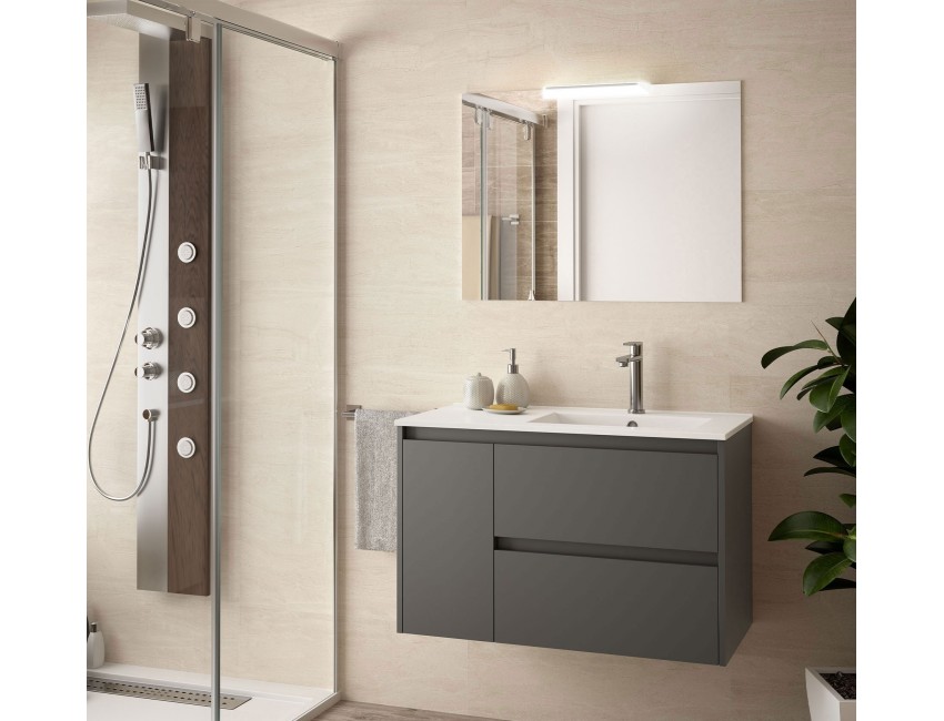 1) Mobile da bagno moderno colore grigio opaco con 2 cassetti ed un'anta a chiusura ammortizzata e maniglia incassata integrata sul frontale del mobile che unisce funzionalità e design. Frontale e laterali sono fabbricati in laminato da 16 mm (classe E-1) con bordi in PVC (con colla PUR).
