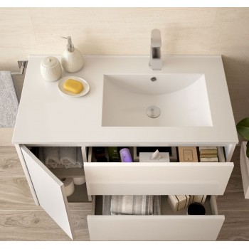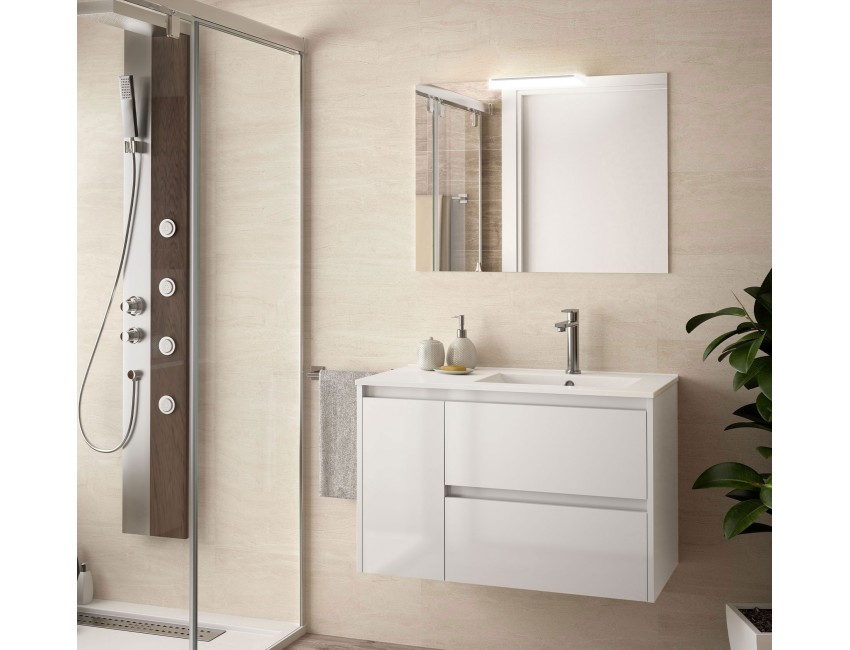 1) Mobile da bagno moderno laccato bianco lucido con 2 cassetti ed un'anta a chiusura ammortizzata e maniglia incassata integrata sul frontale del mobile che unisce funzionalità e design. Frontale e laterali sono fabbricati in laminato da 16 mm (classe E-1) con bordi in PVC (con colla PUR).