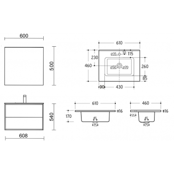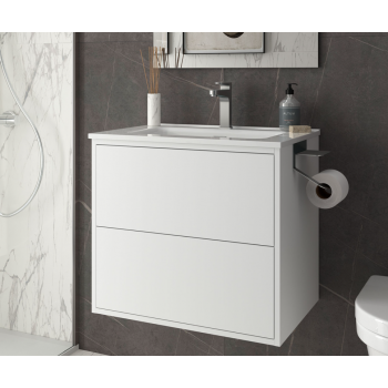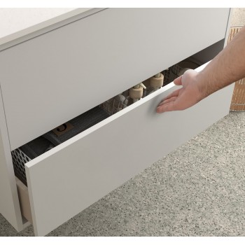 1) Mobile da bagno moderno colore Bianco opaco dotato di 2 cassetti a chiusura ammortizzata e con sistema di apertura a pressione che unisce funzionalità e design. Frontale e laterali sono fabbricati in laminato da 16 mm (classe E-1) con bordi in PVC (con colla PUR). Completo di fissaggi certificati di alta qualità. Divisore per cassetto superiore incluso.