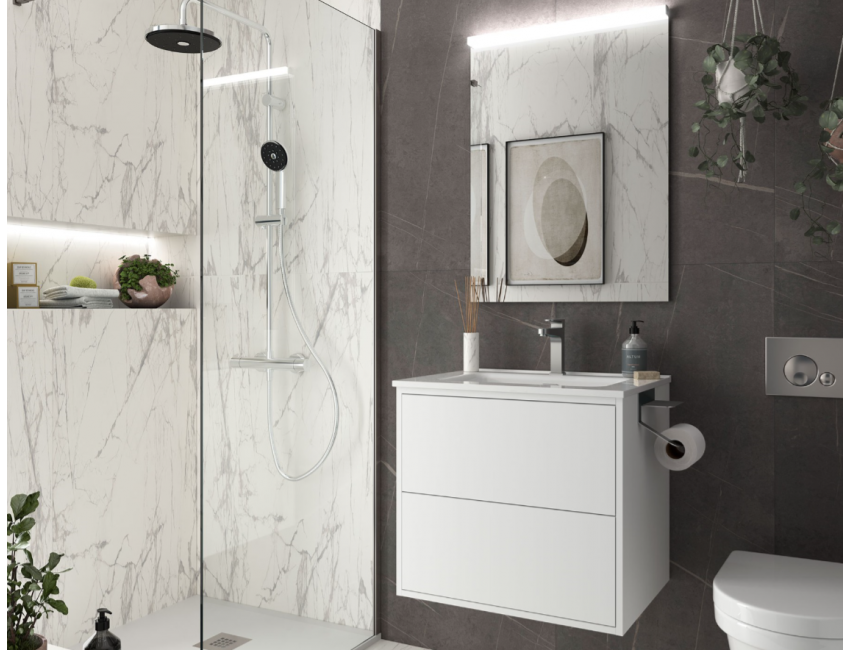 Rubinetteria, sifone, portarotolo e piletta di scarico non inclusi