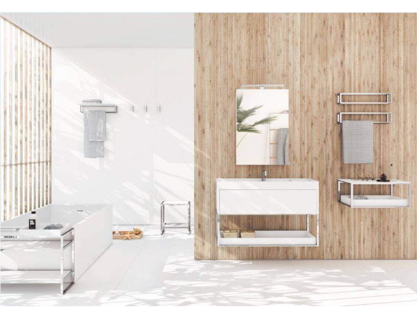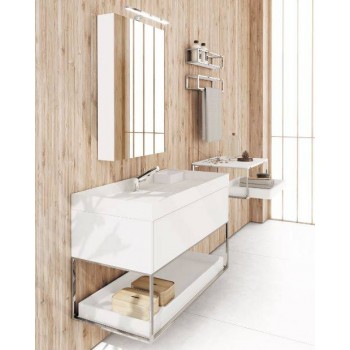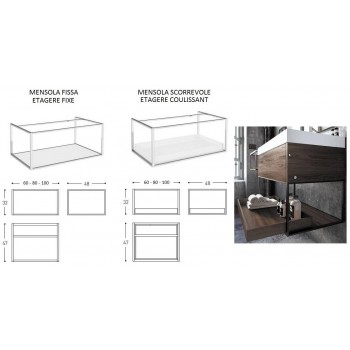 2 tipologie di modulo inferiore: con una mensola fissa, appositamente ideata per riporvi asciugamani, o con una mensola scorrevole (tipo cassetto aperto), che conferisce al modulo una miglior accessibilità e una maggior versatilità