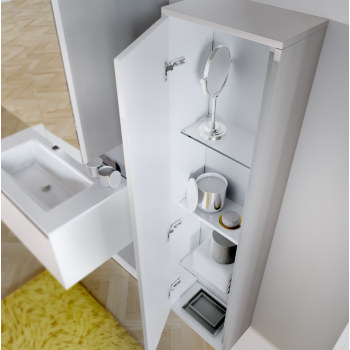 2) Colonna da bagno sospesa in legno, colore Blu Pastello, con un'anta con sistema soft-close e quattro ripiani