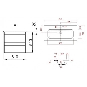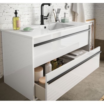1) Mobile da bagno moderno colore Bianco lucido dotato di 2 cassetti a chiusura ammortizzata con maniglia nero opaca che unisce funzionalità e design. Frontale e laterali sono fabbricati in laminato da 16 mm (classe E-1) con bordi in PVC (con colla PUR). Completo di fissaggi certificati di alta qualità.
