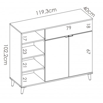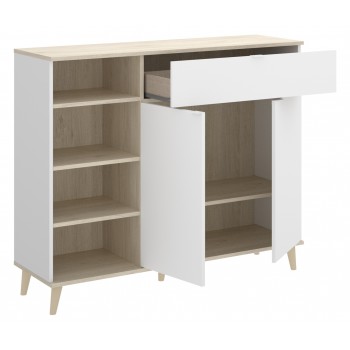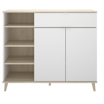 - Con 4 ripiani a vista, un cassetto e due ante con un ripiano.