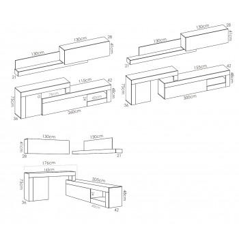 Dimensioni mobile tv: 260/300 cm (larghezza) x 42 cm (profondità) x 75 cm (altezza)