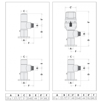 Coppia composta da: valvola termostatizzabile, attacchi a squadra, predisposta per comandi termostatici ed elettronici, detentore, attacchi a squadra, due gusci di finitura copritubo/coprimuro e chiave a brugola.