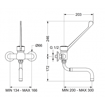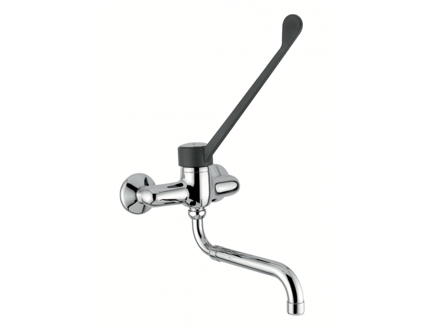 Miscelatore monocomando per lavello da cucina con bocca girevole estensibile, leva clinica per comando facilitato e installazione a parete.