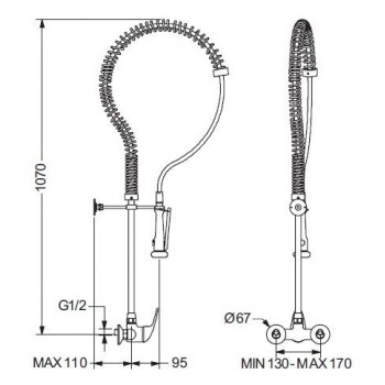 Gruppo doccia di prelavaggio con miscelatore monocomando a parete e valvole di ritegno.