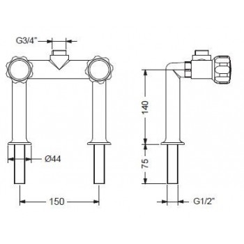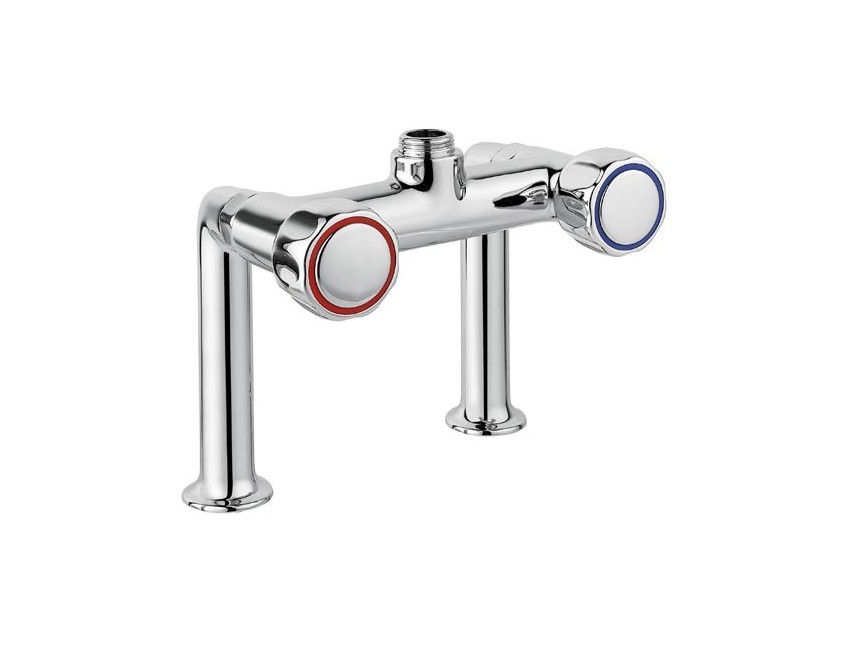 Miscelatore monocomando biforo con comando a maniglie, vitoni a dischi ceramici e squadrette per installazione su piano.