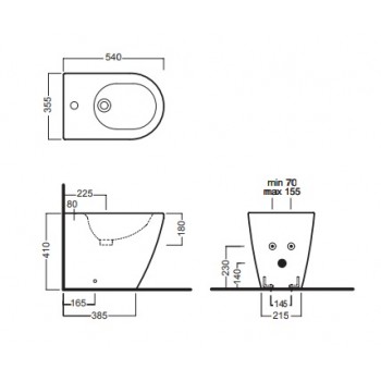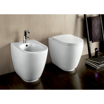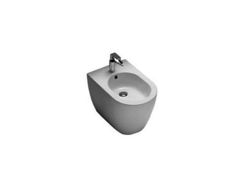 Bidet bianco della serie FUSION filo muro a pavimento senza brida con scarico universale monoforo, completo di fissaggio.