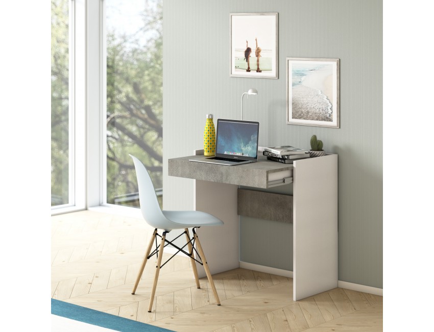 Scrivania 80x40 cm Bianco frassinato e Cemento con cassetto e ripiano