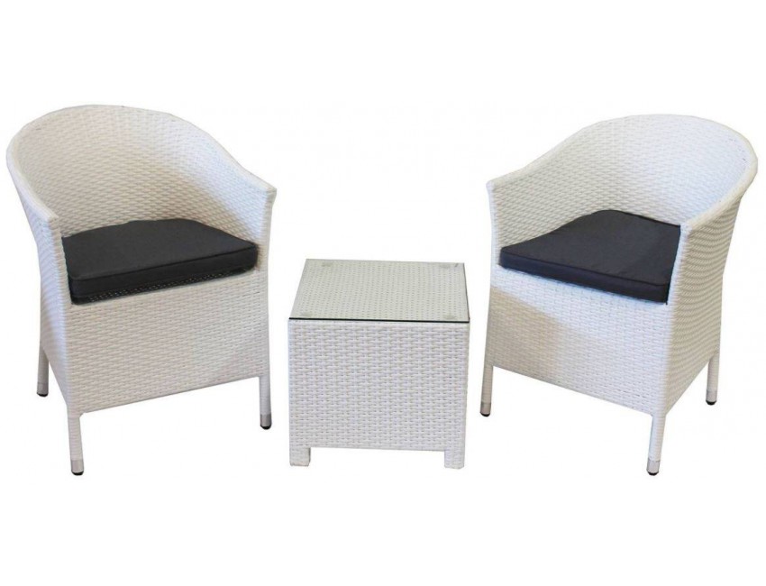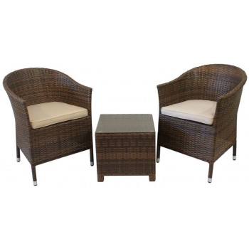 Piccolo set da giardino dall'aspetto decisamente elegante composto da 2 poltrone e un tavolino. I componenti del set hanno una struttura interna realizzata in alluminio e un rivestimento esterno in rattan sintetico (o polyrattan). Il tavolino ha un piano quadrato in vetro temperato trasparente