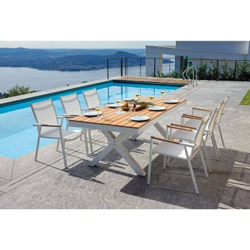 Tavolo da giardino rettangolare con struttura in alluminio verniciato a polvere di colore bianco e piano a doghe in resin wood color legno Teak